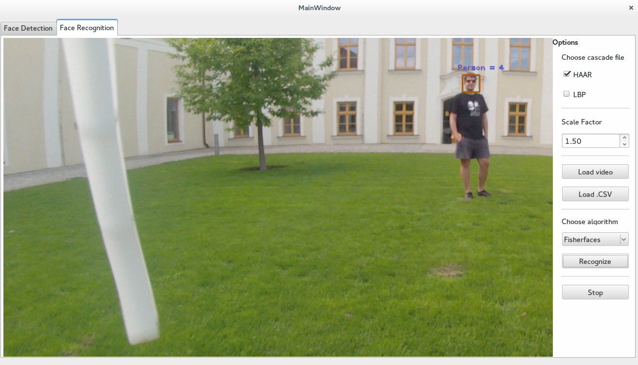 Pro samotné rozpoznávání je použita knihovna OpenCV. Pro detekci obličeje si uživatel vybírá kaskádový soubor, který bude použit pro detekci, nastaví hodnotu ScaleFactor, která definuje jak velmi se zredukuje velikost snímku pro každé měření (ideálně 1,5). Pomocí tlačítka LoadVideo načte video, pomocí tlačítka load .CSV načte cesty a popisy k množině obrázků, které budou následně natrénováno. V dalším kroku si uživatel vybere rozpoznávací algoritmus. Následně je pomocí tlačítka Recognize spuštěno požadované video, ve kterém dojde k detekci obličeje. Výsledkem srovnání je vykresleno ID ve složce, ve které byly snímky rozpoznané tváře uloženy. Vykreslení probíhá přímo do obrázku.